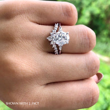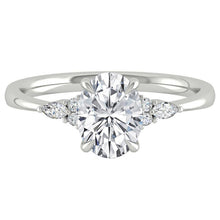 This unique, elegant ring features a dazzling cluster of round and marquise-shaped stones that rest upon the shoulders of the gently tapered band. The center oval cut is held by four claw prongs as it sits upon a slightly open gallery. Perfect for a woman who is like no other.