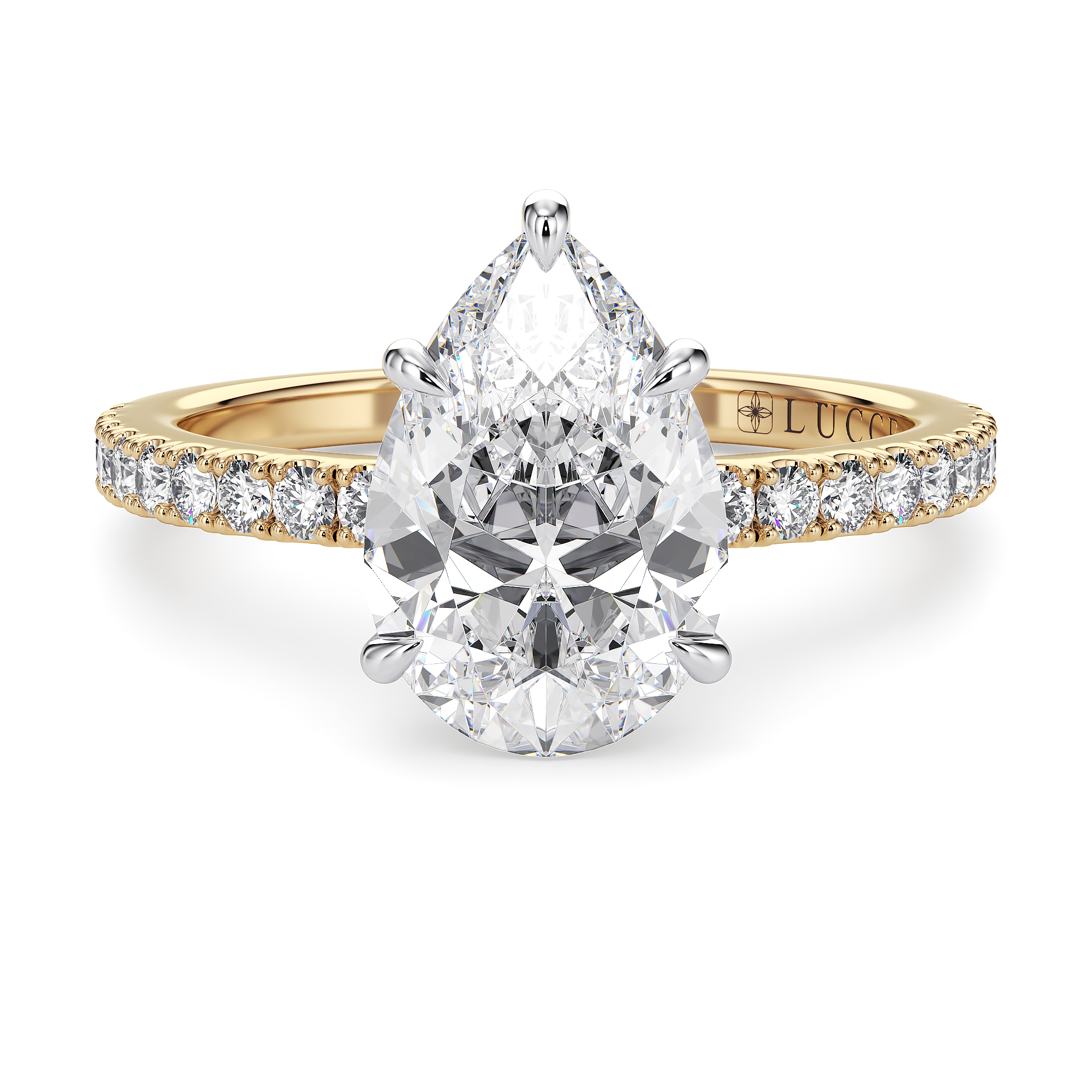 This forever piece features a uniquely wrapped hidden halo and a pavé band. From the top, this pear cut diamond engagement ring appears simple and elegant, but from another angle, a hidden sparkle is revealed, just like her and the quiet depth of the love you share. The wrapped halo symbolizes your heartfelt promise to keep her safe, embraced in your arms and cherished for all the days to come.