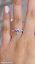 This forever piece features delicate petal prongs, a wrapped halo, and a classic pavé band, a design as graceful and captivating as she is. Like her, its beauty isn’t loud; it blooms softly, effortlessly, like a flower kissed by morning light. This round cut diamond engagement ring's pavé accents shimmer gently, just like the true and steady love you’ve nurtured together.