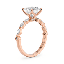 This forever piece showcases a modern marquise cluster setting with delicate petals prongs, forming a graceful floral silhouette. This princess cut diamond engagement ring's marquise accents resemble tender leaves, while end of the band is adorned with a round-cut milgrain dew drops, evoking a freshness of a blooming garden. This ring is a symbol of love that blooms, and a promise to grow and flourish together, always.