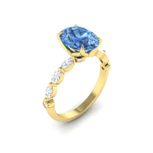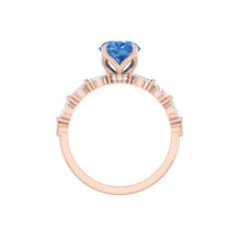 This forever piece showcases a modern marquise cluster setting with delicate petals prongs, forming a graceful floral silhouette. This oval cut blue diamond engagement ring's marquise accents resemble tender leaves, while end of the band is adorned with a round-cut milgrain dew drops, evoking a freshness of a blooming garden. This ring is a symbol of love that blooms, and a promise to grow and flourish together, always.