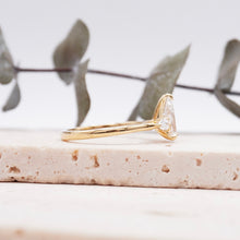 An engagement ring design adorned with three stunning stones — a centerpiece showcasing the finest pear lab-grown diamond, flanked by two pear-shaped diamonds on either side. Crafted with the utmost care, this design serves as a heartfelt declaration of love.