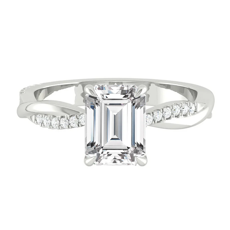 This forever piece features a twisting accented band and Lucce’s signature petal prongs. This emerald cut diamond engagement ring's vine-like band symbolizes two lives intertwined by love, forming an infinity that speaks of a bond that is unbreakable. Like a delicate flower found in vines, it reflects how you found her, beautiful, one-of-a-kind, and meant to be.
