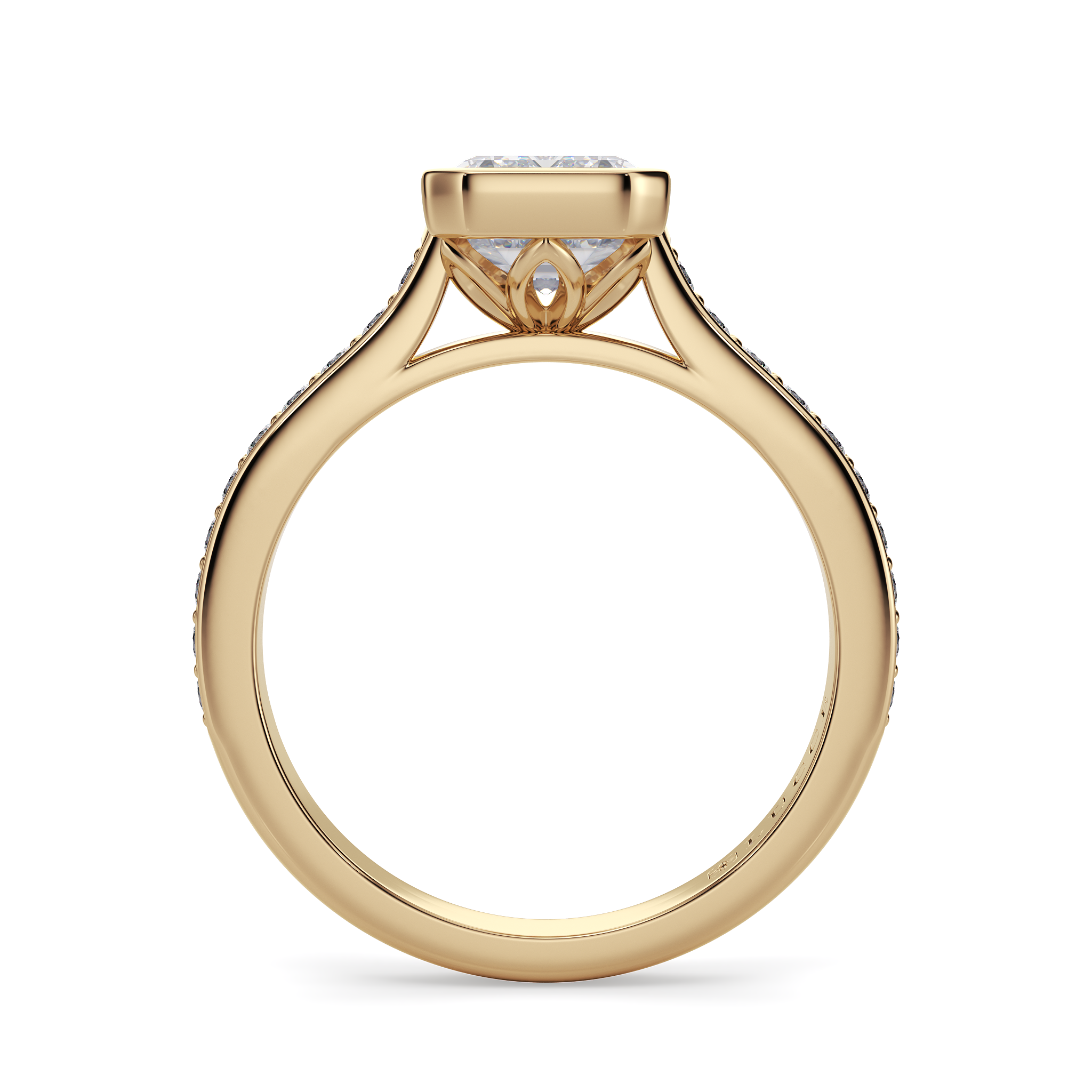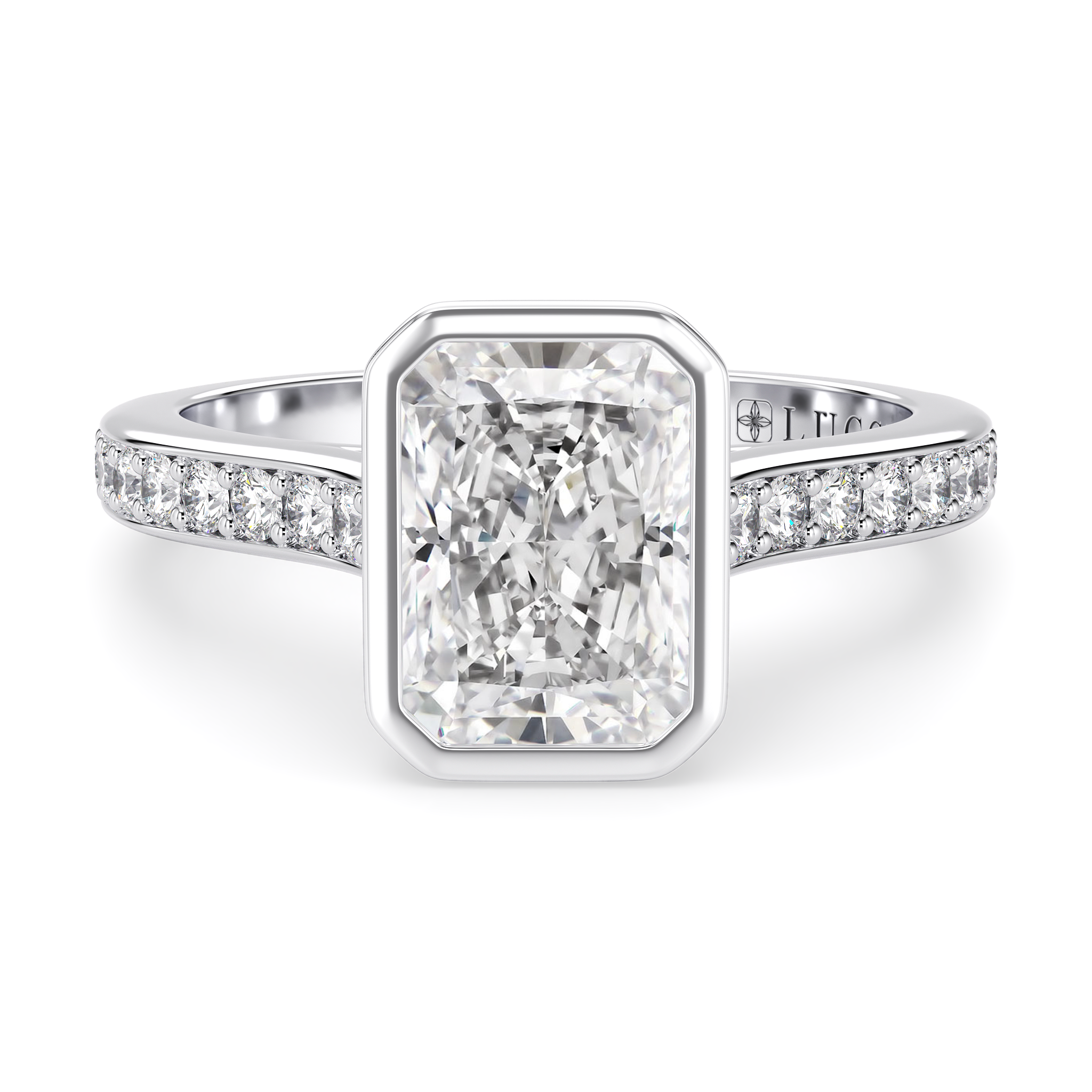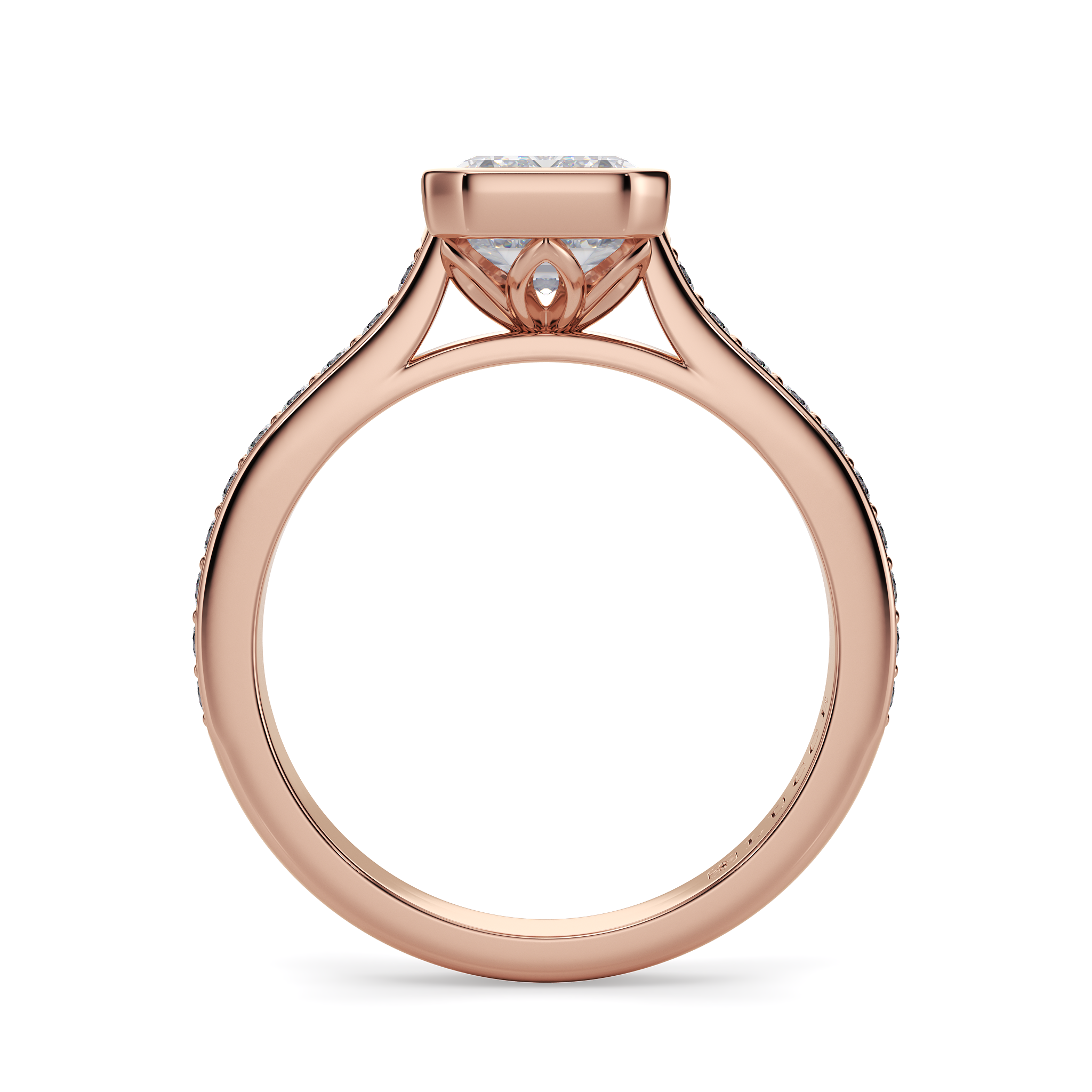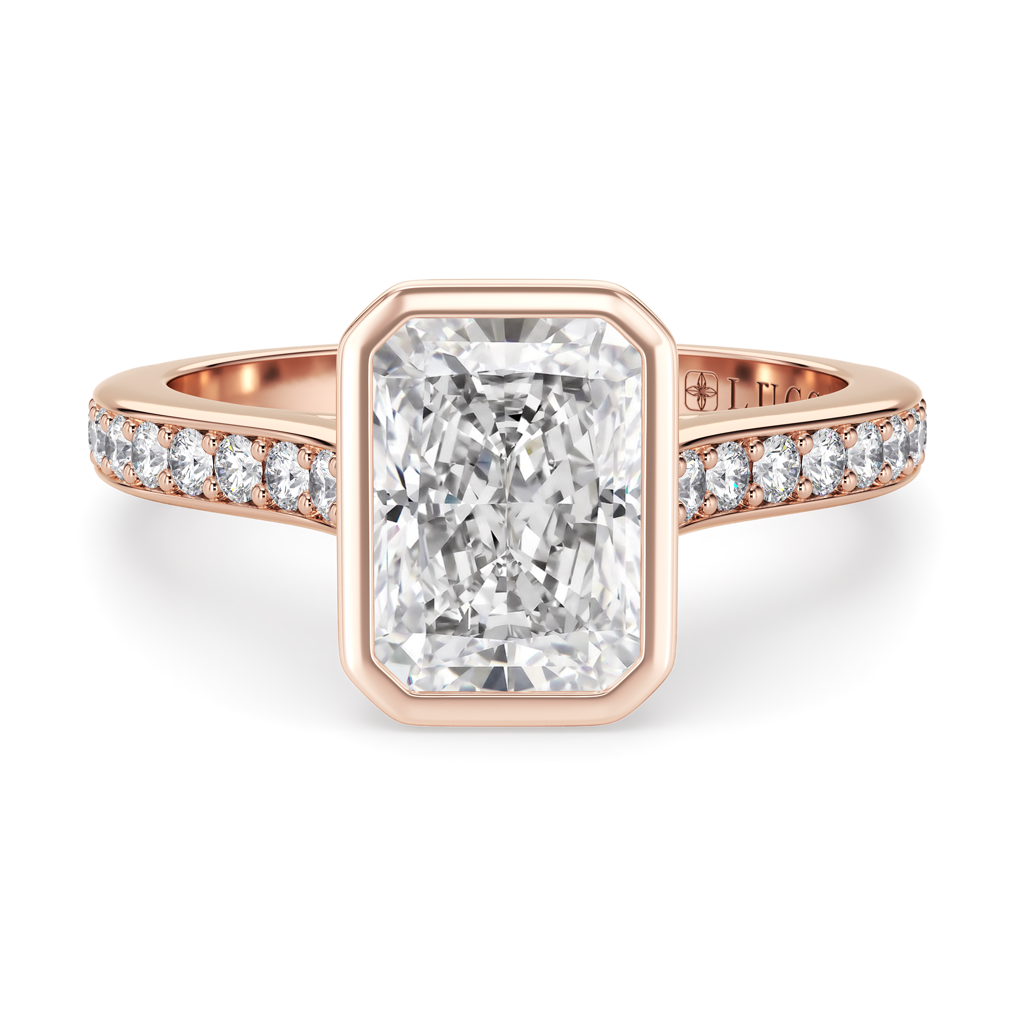 This forever piece is Lucce’s graceful interpretation of a radiant cut diamond engagement ring in a bezel setting and a bead bright pavé band. The bezel gently cradles the diamond, symbolizing your promise to protect her with all your heart and hold her close forever. Beneath it, the soft petals unfold, echoing the love that continues to bloom beautifully, nurtured and tenderly safeguarded by your devotion.