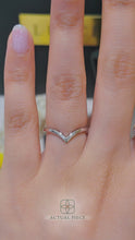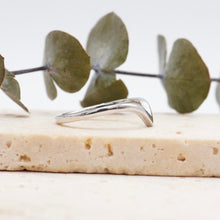 A smooth strand of precious metal cascades down the finger creating a curved chevron shape. This stylish ring is perfect on its own or paired with an engagement ring.