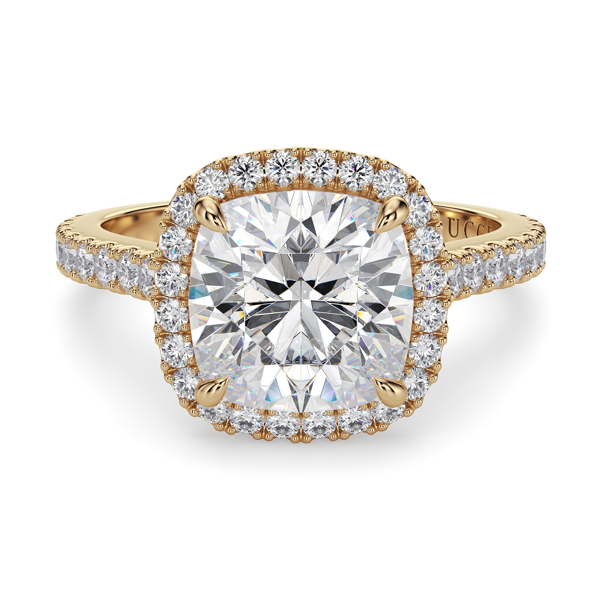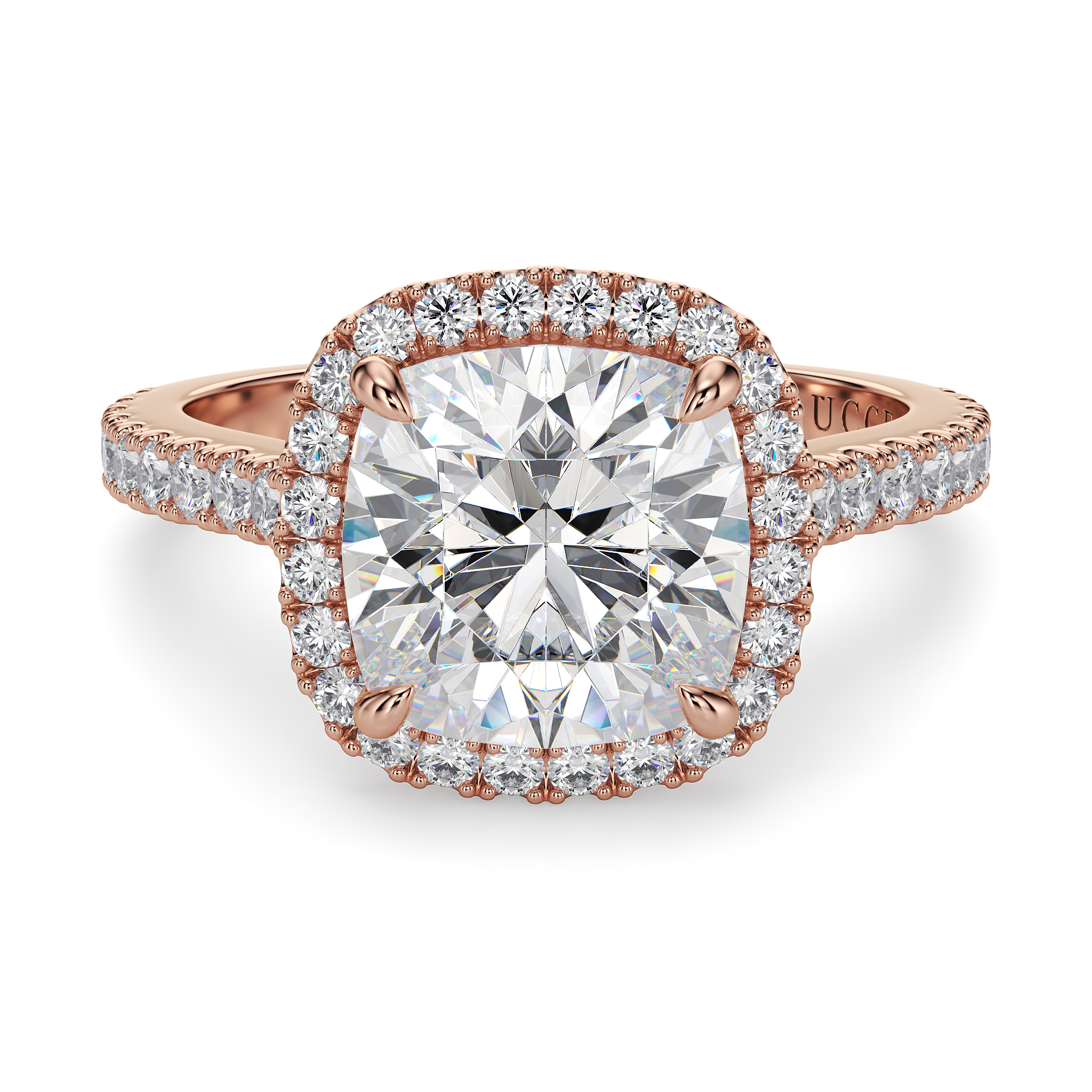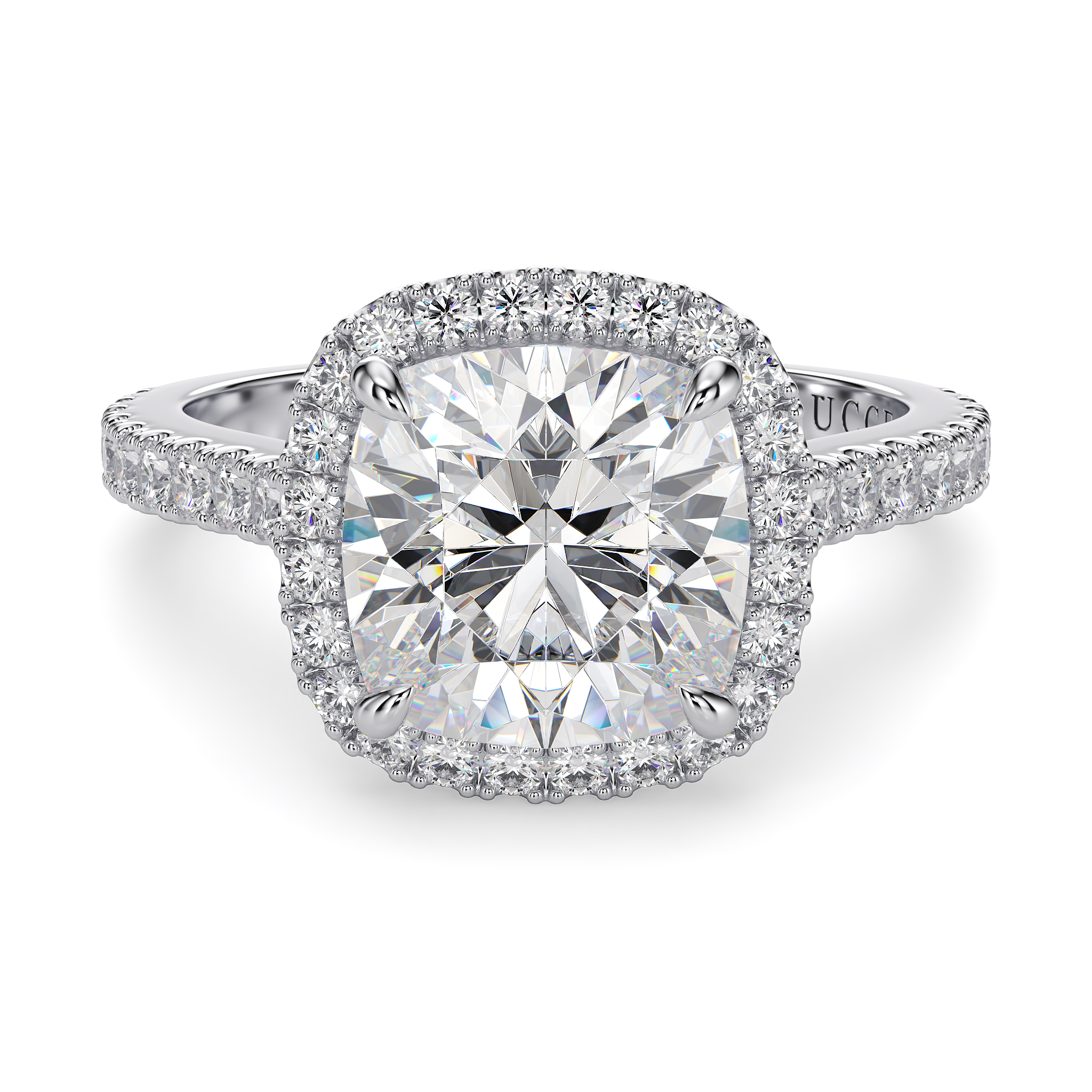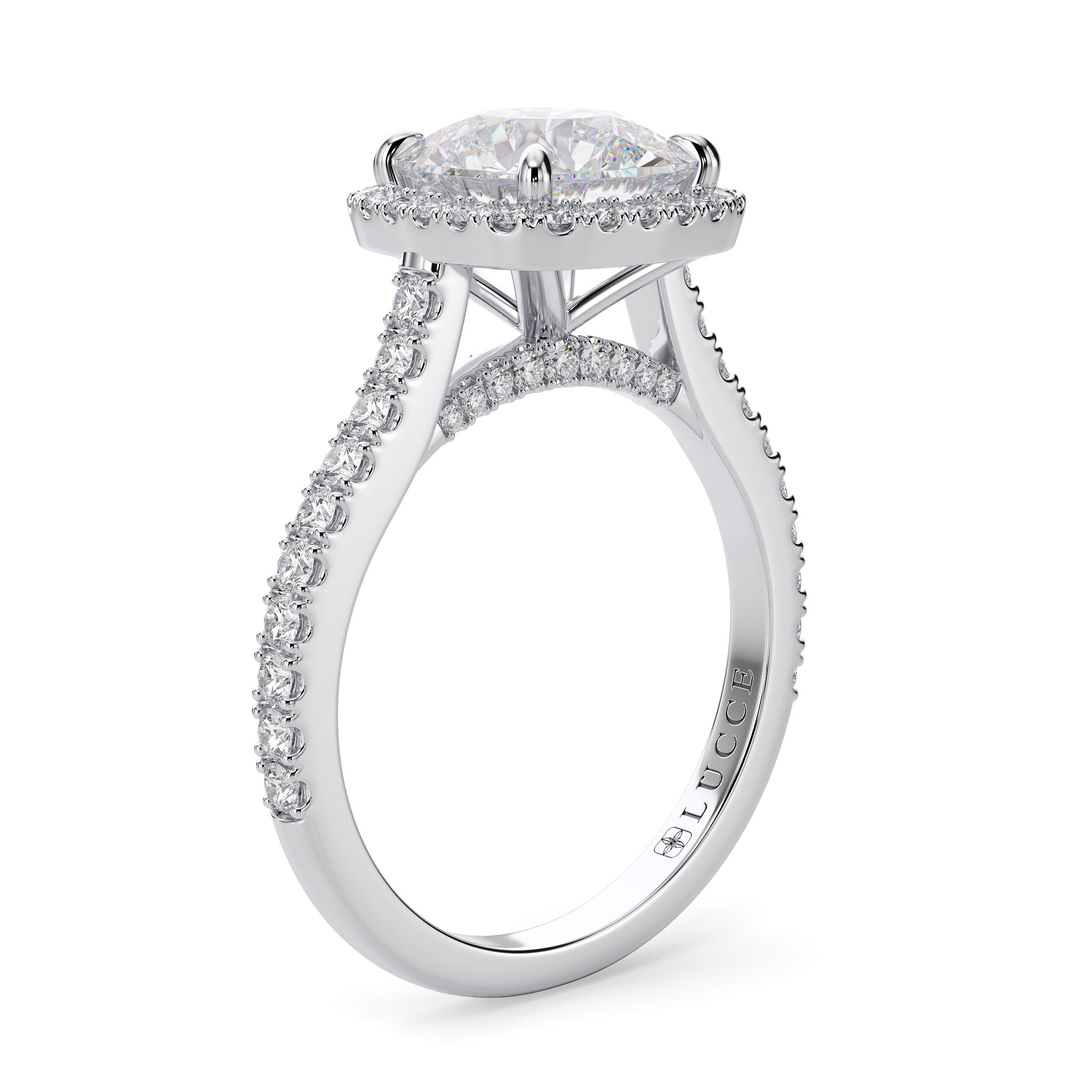 This forever piece features a halo pavé setting with Lucce’s signature tapered bridge. This cushion cut moissanite engagement ring's timeless design speaks of a love without end, just like the halo itself. And like the halo of an angel, it reflects how she’s brought light into your life, made you better, and inspired you to be the best partner you can be for her, always.