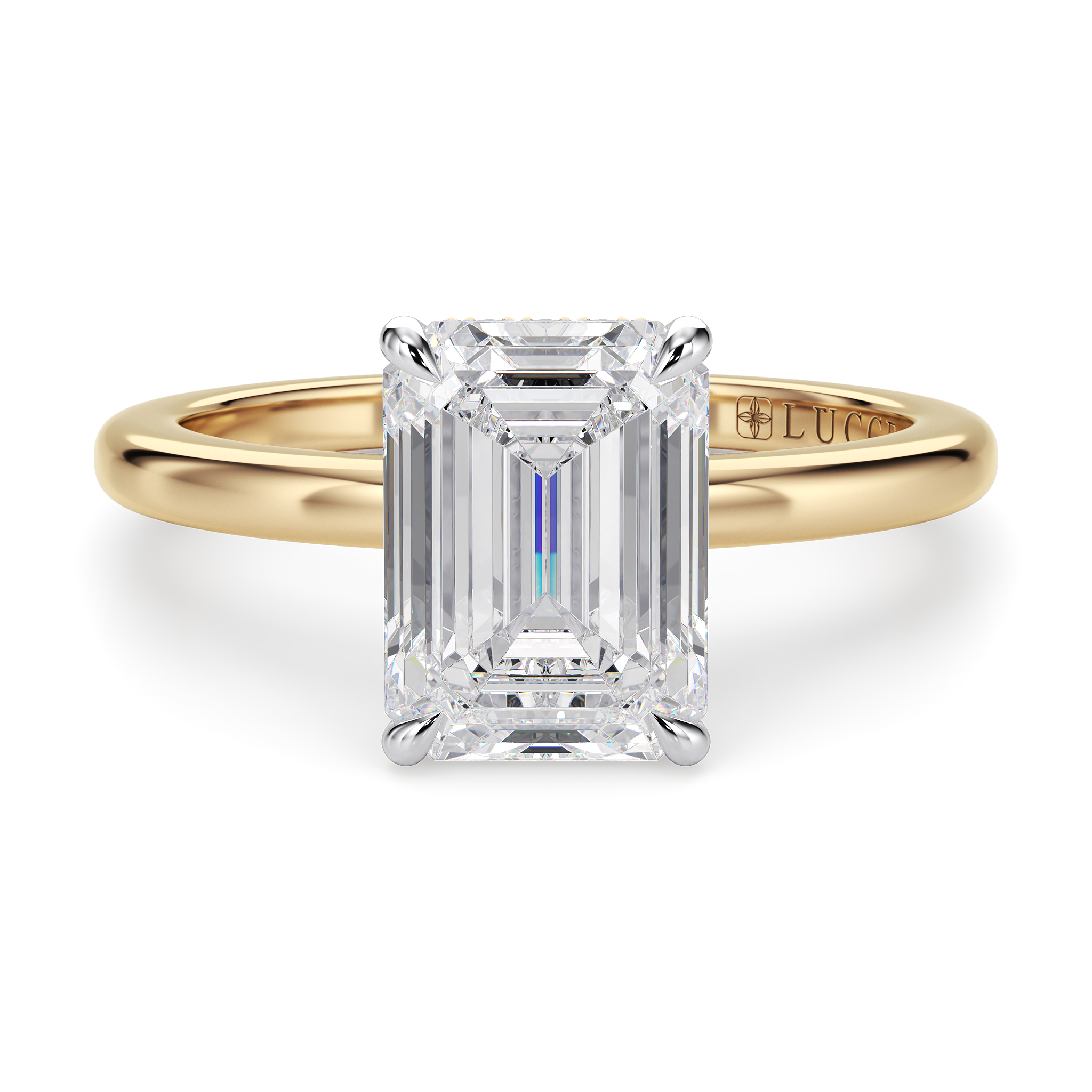This forever piece features a uniquely wrapped hidden halo and a classic solitaire band. From the top, this emerald cut diamond engagement ring appears simple and elegant, but from another angle, a hidden sparkle is revealed, just like her and the quiet depth of the love you share. The wrapped halo symbolizes your heartfelt promise to keep her safe, embraced in your arms and cherished for all the days to come.