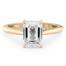 This forever piece features a solitaire cathedral setting with an accented tapered bridge and delicate petal prongs. This emerald cut diamond engagement ring is like a singular, delicate flower, offered to the one your heart cherishes most. The cathedral’s graceful arcs lift toward the petals, symbolizing how you see her, your queen, radiant and blossoming. The tapered bridge reflects the journey you share, as you cross into a new chapter of love, hand in hand.