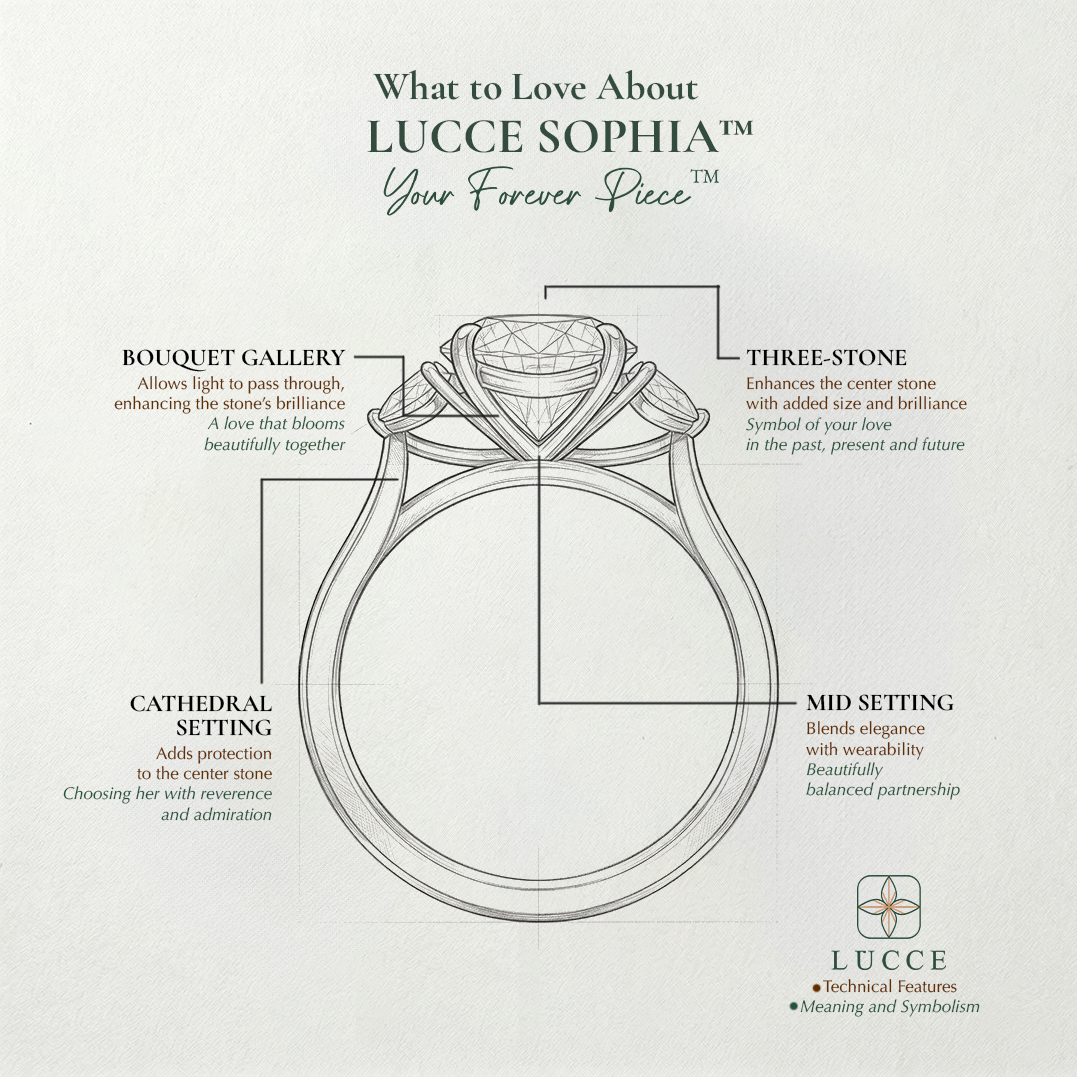 This forever piece is Lucce’s modern take on the timeless three-stone ring. This Pear cut engagement ring's trio of diamonds blooms like a bouquet, each stone representing the love you’ve shared in the past, share in the present, and will share in the future. It’s like saying I love you, not just once, but as a promise you’ll keep whispering for a lifetime.