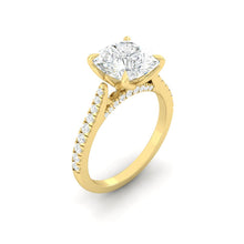 This forever piece showcases a pavé cathedral setting with an accented tapered bridge and delicate petal prongs. Like a captivating flower in full bloom, this cushion cut diamond engagement ring is offered to the one your heart cherishes most. The graceful arcs of the cathedral rise toward the petals, symbolizing how you see her, your queen, radiant and blossoming. The tapered bridge reflects the journey you share, as you cross into a new chapter of love, hand in hand.